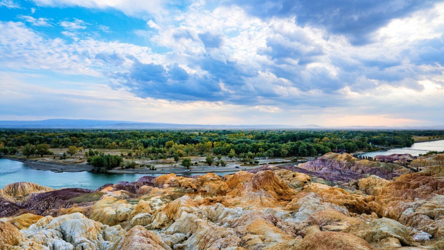 Dominantou oblasti jsou hory Altaje, zelené pastviny a jezera, která mají barvu, jakou byste čekali spíš v Kanadě než v západní Číně. Jedním z nejznámějších je Kanas — hluboké horské jezero obklopené lesy, které na podzim explodují barvami.